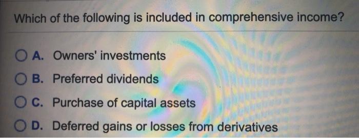 C is incorrect because unrealized holding gains and losses from the reclassification of a debt security from available-for-sale to. A Owners investments B Purchase of capital assets C Preferred dividends D Deferred gains or losses from derivatives. Distribution to the owners.